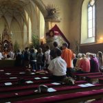 Eine gute Wahl waren auch die modernen Jugendlieder, welche alle Teilnehmer von den gedruckten Liedblätter mitsingen oder mitverfolgen durften. Die aparte Klavierbegleitung zu diesen Liedern übernahm Pfr. Andreas Hartig. Die Lieder und die Gesangsfreude der Anwesenden liessen spüren, dass im Gottesdienst neue und ungewohnte Gestaltungs-Elemente im Gottesdienst, durchaus willkommen sind. So auch das Fürbitten- und Sonnengebet: die Teilnehmer durften in stiller Meditation eine kleine Kerze anzünden und im Chorraum aufstellen. Bei dieser besonderen Handlung erstrahlten viele Lichter und vor allem die Gesichter. Solch ein Pfingstfest wird sicherlich für alle Beteiligten in guter Erinnerung bleiben.