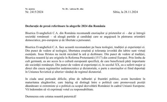 Am 06.11. trafen sich die Presbyter unserer Kirchengemeinde mit dem Architekten Alexandru Nechifor um die Lage der Kirchenmauer und Lösungen zur neu entdeckten Kirchengruft zu besprechen. Die ersten Schlussfolgerungen zeigten die Notwendigkeit von Studien, um sowohl den […]
