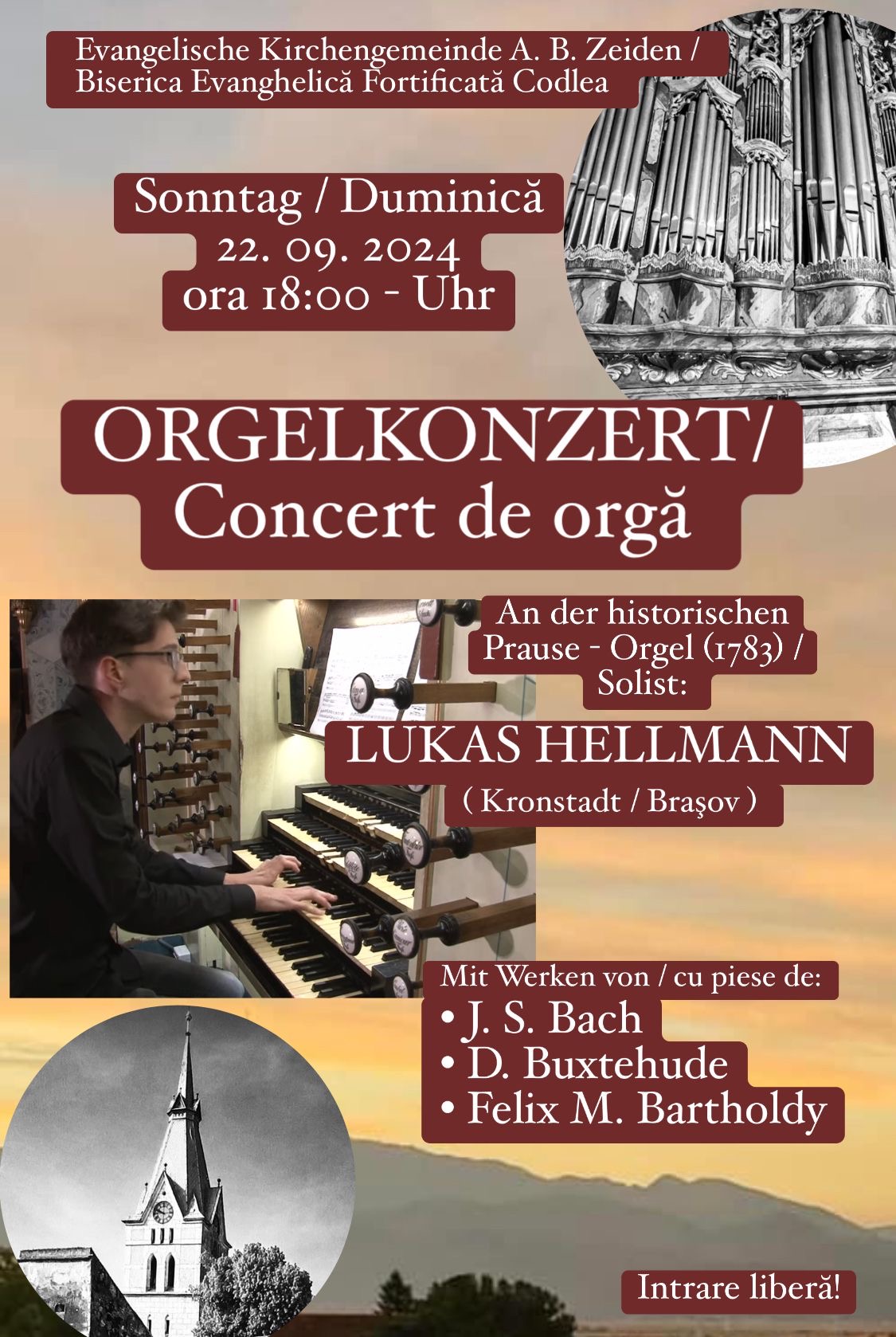 Duminică începând cu ora 18, Lukas Hellmann din Brașov va interpreta piese din repertoriul lui J.S. Bach, D. Buxtehude și Felix M. Bartholdy la orga noastră Prause istorică.