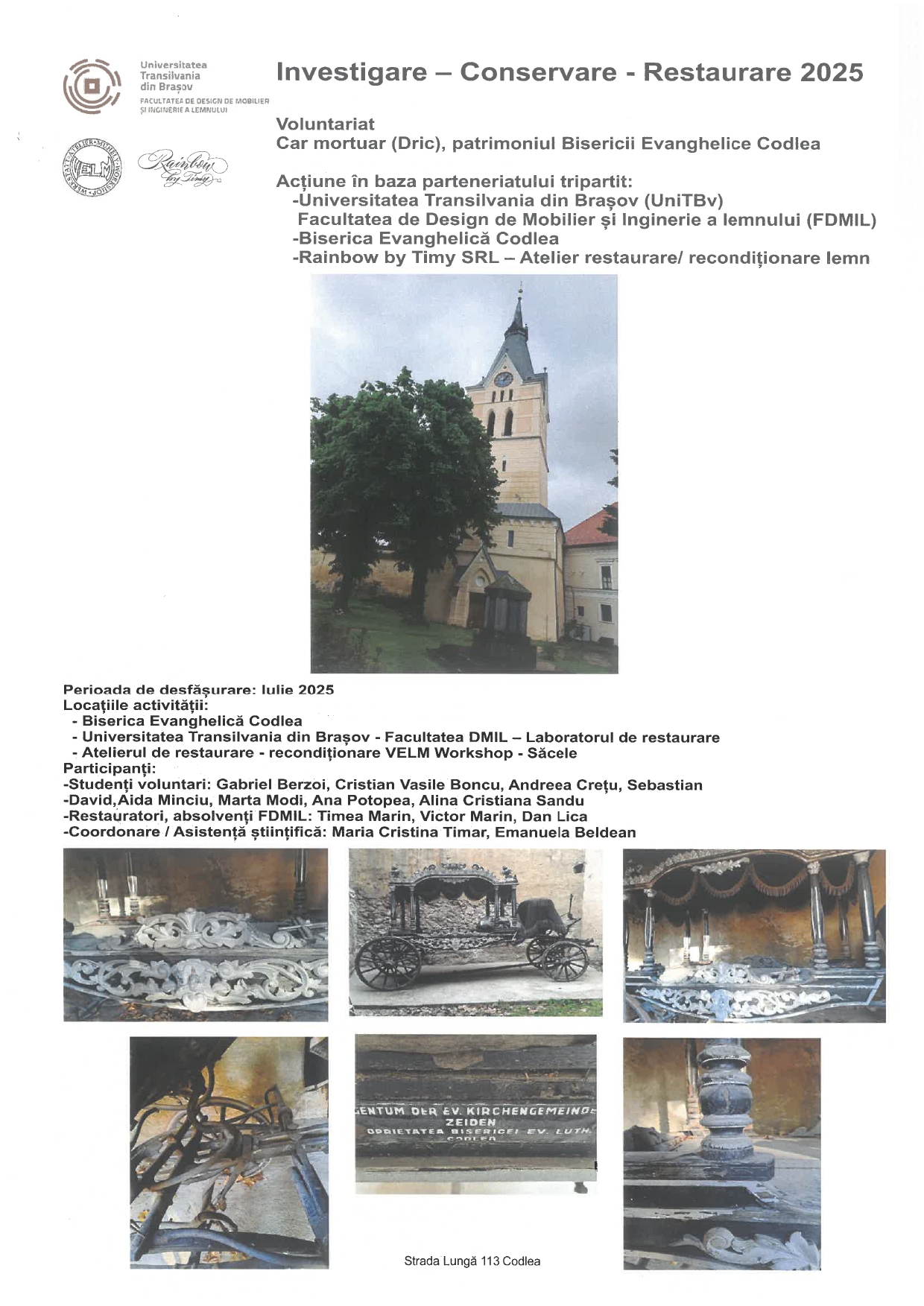 Die Beteiligung der Evangelischen Kirche an dem Projekt zeigt die Offenheit der lokalen Gemeinschaft für die Zusammenarbeit mit dem akademischen und beruflichen Umfeld. Die Restaurierung des Leichenwagens ist nicht nur ein Akt der Konservierung, sondern auch ein Zeichen der Identitätsfindung. Der Abschluss des Projekts wird ein vergessenes Kulturerbe wieder ins öffentliche Bewusstsein rücken, das jedoch eine wichtige Rolle in lokalen Ritualen und Traditionen der Vergangenheit spielt. Darüber hinaus soll das Projekt ein Modell bewährter Verfahren für die Zusammenarbeit zwischen Universitäten, lokalen religiösen Autoritäten und privaten Einrichtungen im Bereich der Restaurierung entwickeln, um das bauliche und mobile Erbe Rumäniens zu bewahren und aufzuwerten.